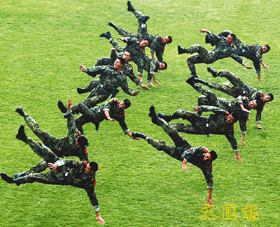 20日,中國保安人員在蘭州市進行武術演練,準備對抗恐怖襲擊。 (美聯社)