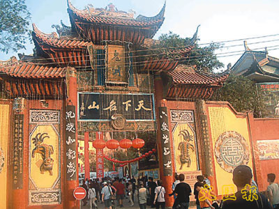 酆都鬼城山門前緊張施工的場面,給新三峽旅遊帶來負面影響。 (本報重慶傳真)
