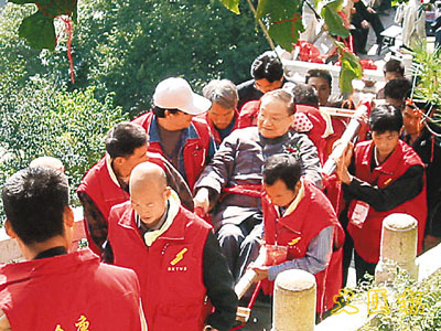 金庸乘坐轎子上華山「論劍」。 (資料圖片)