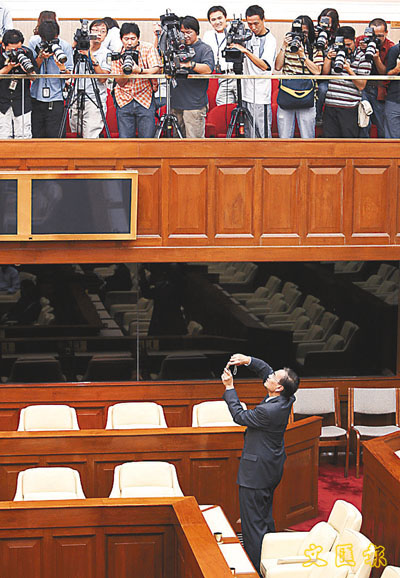 議會「新丁」劉秀成似乎對立法會的議事堂極感「興趣」,參加培訓班時,不停用相機拍照,似與採訪的記者鬥拍,場面有趣。 (張立新 攝)
