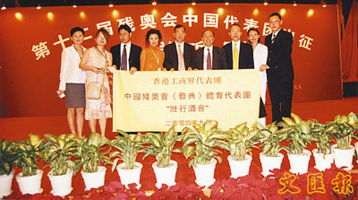 【本報訊】應中國殘奧會之邀請,由香港工商界知名人士潘以和為團長,王鶴年、連廣成為副團長,潘偉生教授及葉聯意為顧問,劉鈺珍為秘書長的香港工商界代表團,日前赴北京出席了中國殘聯、國家體育總局和中國殘奧會共同舉行的「第十二屆殘奧會中國代表團出征雅典之歡送晚宴」。