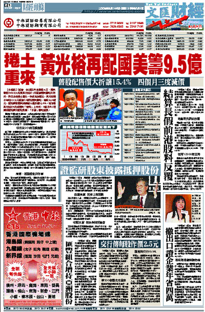 國美昨日開市前申請停牌,市場消息指出涉及該公司主席兼大股東黃光裕配售舊股。消息指出,黃光裕擬以每股3.9至3.98元於市場配售2.4億股國美舊股,並擁有15%的超額配股權,集資最多10.98億元,安排行為荷蘭銀行。國美停牌前每股報4.7元,與今年最高的17.6元比較下,累積跌幅逾70%。