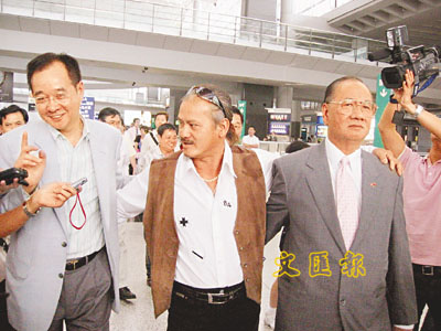 港商何志輝(中)腰部受傷,昨在鄉親及西貢區議會主席吳仕褔(左)的攙扶下離開機場。 (歐陽芷欣 攝)