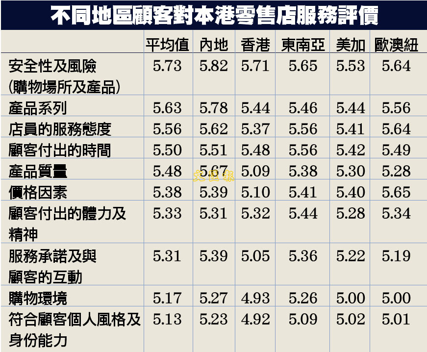 不同地區顧客對本港零售店服務評價 (圖)