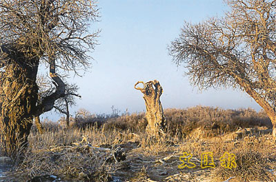 胡楊不能倒。因為人類不能倒,因為人類文明不能倒。胡楊曾孕育了整個西域文明。兩千年前,西域為大片b郁的胡楊覆蓋,塔里木、羅布泊等水域得以長流不息,水草豐美,滋潤出樓蘭、龜玆等三十六國的西域文明。拓荒與爭戰,使水和文明一同消失在乾涸的河床上。胡楊林外,滾滾的黃沙埋下了無數輝煌的古國,埋下了無數鐵馬冰河的好漢,埋下了無數富麗奢華的商旅,埋下了無知與淺薄,埋下了驕傲與尊嚴,埋下了伴他們一起倒下的枯楊。讓胡楊不倒,其實並不需要人類付出甚麼。胡楊的生命本來就比人類早很多年。(上)