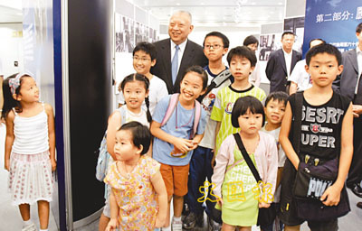 尤其是小朋友,更加個個圍著「董伯伯」轉,亦步亦趨跟著特首步伐。膽子大一點的,一個箭步走到特首面前:「可以跟我合照嗎?」董生向來喜歡小朋友,自不會令小朋友失望,更加主動邀約其他在旁熱切觀望的小朋友:「一齊?謎v啦,自然?喎!」他又指著一塊展板,笑問那名「膽粗粗」以「董建華」相稱的小朋友:「你識唔識睇啊?」小朋友又果真「有?料到」,正確地讀完整個圖片說明,換來董生開心鼓掌大讚:「好?瓮{,真係好!」