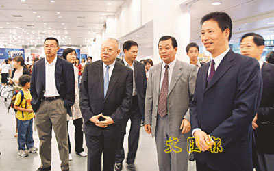 董建華父子昨天由新華社攝影部主任徐祖根(右一)及本報社長張國良陪同,參觀「中國外交55周年成就圖片展 」。