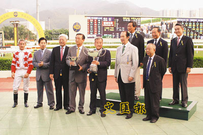 杜利萊策騎的「大好友」捧中華游樂會盃。賽後何鴻燊及陳祖澤等馬會高層與馬主及練馬師葉楚航齊影威水相。