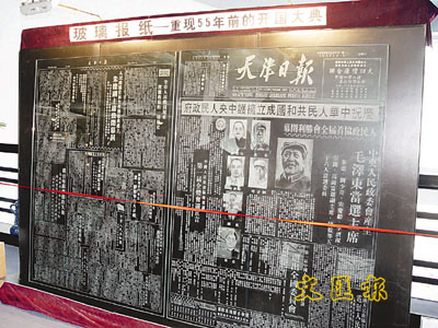 2日,一張反映開國大典盛況的巨幅玻璃報紙在浙江省台州市椒江吳子熊玻璃藝術館公開展出。報紙內容為1949年10月1日出版的《天津日報》。(新華社)
