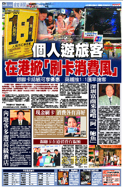 【本報訊】(記者 胡靜嫻)在不少港人的印象中,內地旅客在港消費模式是「拿出一疊疊鈔票慢慢數」。不過,隨著銀聯卡在香港逐步通行,加上許多商家紛紛推出各種「用卡優惠」刺激內地客消費,包括電器舖推出「刷卡」2,000元可享100元現金回贈的新優惠,這次國慶黃金周內地客「刷卡」量激增。有化妝品公司表示,銀聯卡結帳額較「五一」黃金周急升近50%。