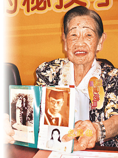 容德芬展示的結婚照,是1928年她在廣州舉行新式婚禮時所拍的。 (羅瑩芝 攝)