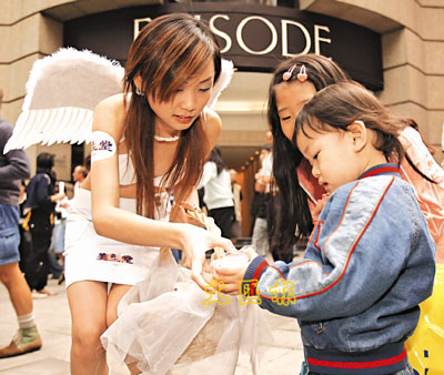 氣溫驟降,衣著清涼的美少女仍扮成天使在中環街頭派雪糕,引來熱情的小朋友品嚐。(張立新 攝)