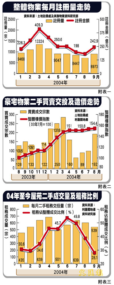 中原地產研究部高級經理黃良昇指出,總結今年首9個月的登記數字顯示,今年首9個月累積數字達88,347宗,總值2,389億元,已分別比03年全年超出1.2%及26.6%,預期今年全年的登記宗數可望達12萬宗,創出97年來的新高。展望2005年的樓市較今年更優勝,將進一步推高全年的登記宗數,超過12萬宗水平。