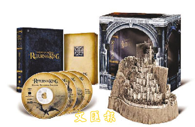 此外要說一些新情報,就是《魔戒三部曲:王者再臨》(The Lord of the Rings: The Return of the King)的4 DVD豪華完整版及5 DVD豪華完整限量珍藏版會在12月推出。據本少爺所知4碟裝會收錄50分鐘未曝光片段及幕後花絮外,並有4段由導演、主角、攝製隊伍及設計師之講評等。而5碟裝的Bonus DVD則有長達52分鐘的奧斯卡最佳配樂得主侯活蘇專訪及蒙特利爾交響樂管弦樂團的演奏會,並有一座「米那斯提力斯」(Minas Tirith)城堡模型。本少爺率先刊登該BOX SET照片給大家「止下渴」先,各位儲定錢吧!