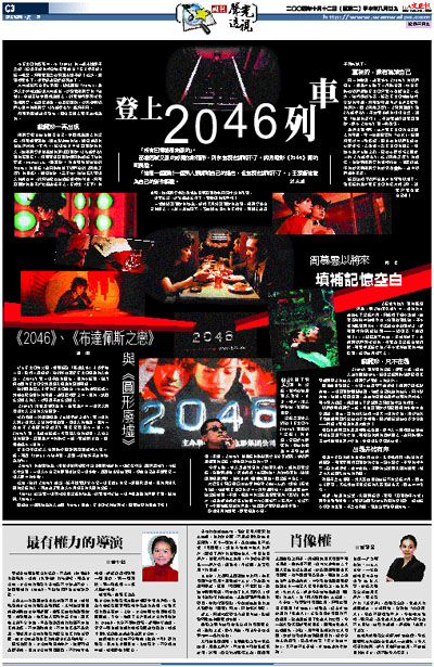 ¡@¤ì§ø©Ý«v¿W¦Ûµn¤W¦C¨®¡A¿ï¾ÜÂ÷¶}¡u2046¡v¡C¼vµû¤H§õÚZ®ç«ü³oÓ¤ì§ø©Ý«v¡A¨ä¹ê¬O©P¼}¶³ªº¡u¥L§Ú¡v¡A¶H¼xµÛ¥L¥ø¹ÏÂ\²æ¹L¥h¡C©ó¬O§ÚÌ«K¥i¥H¬Ý¨ì©P¼}¶³¡A¦³ÂI¨à¦n¦â¡A¦³ÂI¨àµTº¾¡A¨ä§Î¶H»PÆ[²³¤ß¥Ø¤¤ªº©P¼}¶³¡]¡mªá¼Ë¦~µØ¡n¡^ºIµM¤£¦P¡C