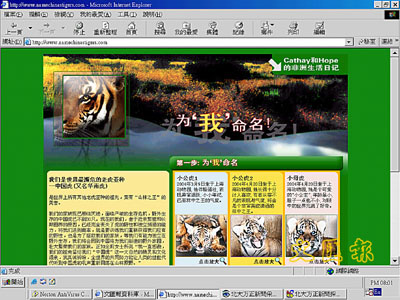 今個月29號,國泰就會安排3隻中國小虎坐飛機由北京經香港轉飛約翰尼斯堡接受訓練。佢瓊兩個師姐和師兄,「國泰」同「希望」就率先黑礎~出發鱈n非留學,唔使一年就可以重拾狩獵鴷趙遄A由以前習慣被人餵飼,進步至成功捕殺小岩羚。今次呢兩隻老虎仔同一隻老虎女就仲未改名,有興趣幭牧怚i以上呢個網頁www.namechinastigers.com(見圖)提供意見。