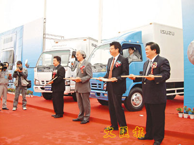 重慶市吳家農副市長、慶鈴公司吳雲總經理與日本五十鈴公司的代表將首批600P商用車的鑰匙交付用戶。(徐家強 攝)