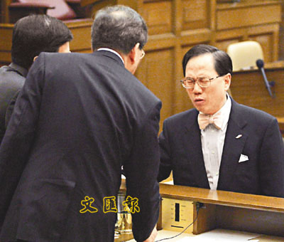 政務司司長曾蔭權與同僚握手時眉頭緊皺,未知有何難題。(張立新攝)