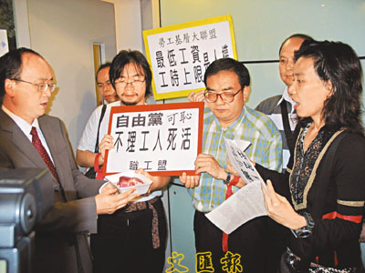 立法會前晚討論由工聯會議員陳婉嫻提出的設立最低工資、最高工時的動議,結果在功能界別分組點票時遭否決,議案無法通過。昨日上午,以職工盟為主的基層勞工大聯盟,找上門同自由黨「算帳」,請願人士到達皇后大道中衡怡大廈後,逕自衝上位於4樓的自由黨總部抗議。聯盟代表稱,「自由黨在周三晚投票時,出賣工人利益,罔顧工人死活,否決了設最低工資、最高工時的動議。田少有膽否決議案,但無膽面對群眾,譴責自由黨!」另有代表稱,田北俊從來未接過請願信,是漠視基層團體的意見。請願人士還以一個飯盒蓋裝著血淋淋的「狼心狗肺」,贈送給接請願信的總幹事史文鴻。其間還有人喊出:「打倒商人政黨!」
