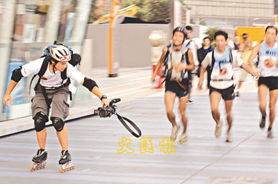 星光大道除有大量個人遊遊客外,也活動連連。一項由大埔郊區,沿路以各式項目比試體能的鐵人耐力賽,直至星光大道為終點,更有攝影師以腳踏滾軸溜冰鞋,追逐抵達終點的鐵人,高技術的追攝如同表演,令人嘆為觀止。 (潘達文 攝)