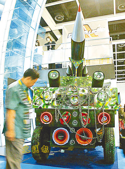 一連4日的香港秋季電子產品展昨日在會展中心閉幕,展覽會吸引超過1900家本港及來自台灣、內地的廠商參展。圖為內地音響生產商展出別具特色的飛彈模型卡車,車上設有多個不同大小及型號的喇叭。(法新社)