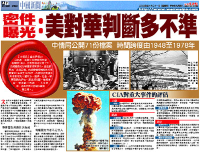 【本報訊】據世界報20日消息:美國中央情報局於當地時間18日,史無前例地公開了71份絕密級的涉華國家情報評估。這批被稱為「追蹤巨龍」的絕密情報檔案的時間跨度是1948至1978年,內容涉及美國中央情報局對中國政治、經濟、社會、軍事發展的評估、展望與判斷。情報專家、學者蘇丁格說:「不幸的是,這些文件只有極少數判斷正確。」