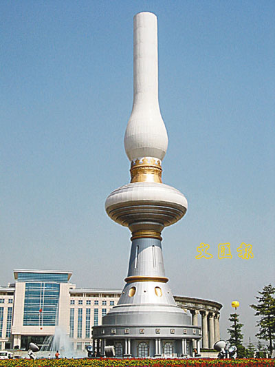 按照1比10的比例製作的「世紀燈王」模型矗立在中山古鎮體育館廣場。