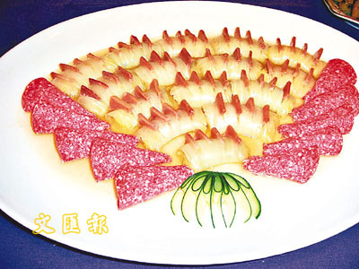 切好的津菜中間夾著金華火腿,蒸好後倒入鮮甜的李錦記蒸魚豉油及濃甜的李錦記煲仔飯醬油,形成一把閃亮通透的玉扇。津菜吸收了醬油的鮮味,清而不寡,嫩滑軟火念。
