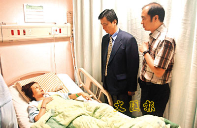 港府派出的醫生(右)和台灣「陸委會」代表到醫院探望譚秋芳。(蔣焯文台北傳真)