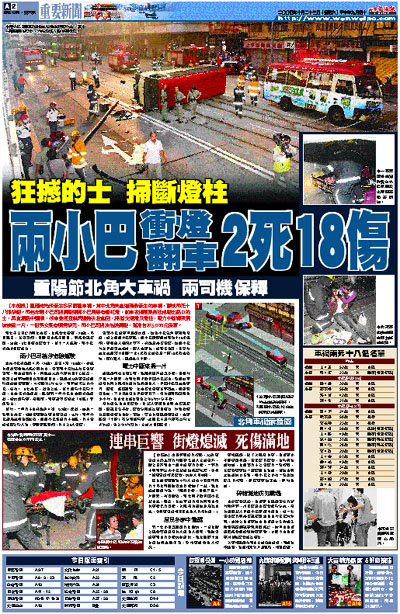 【本報訊】重陽節先後發生多宗嚴重車禍。其中北角英皇道清晨發生的車禍,釀成兩死十八傷慘劇。兩名年輕小巴司機駕駛通宵小巴疑爭客衝紅燈,前車在健康東街狂撼駛出路口的士,再直插路中鐵欄,後車急速扭?閃避時失控翻倒,掃斷交通燈及燈柱,電力中斷導致現場漆黑一片,一對男女乘客頭爆慘死,兩小巴司機涉危險駕駛,獲准各以5,000元保釋。
