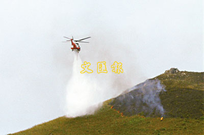 直升機投擲水彈撲救山火。