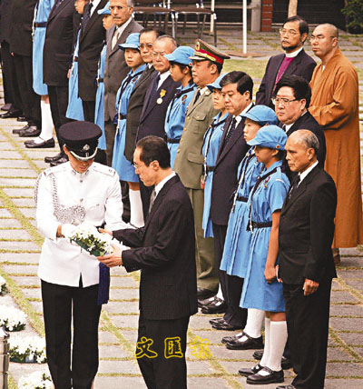隨後,署理行政長官唐英年首先為悼念保衛香港而捐軀的人士敬獻了白色鮮花,特區終審法院首席法官李國能、行政會議成員梁振英、立法會內會主席劉健儀、警務處處長李明逵亦分別代表特區政府有關機構向烈士敬獻了花環。