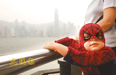 昨日維港天氣朦朦朧朧,連蜘蛛俠也到來看看。(張立新 攝)