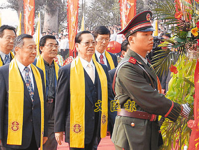 全國人大代表、香港僑界社團聯會會長陳有慶(前中)等港澳台僑胞代表昨日為炎帝敬獻花籃。中國僑聯與湖南省政府在湖南省炎帝陵聯合舉辦祭祖大典,祭祀炎帝神農氏。 (新華社)