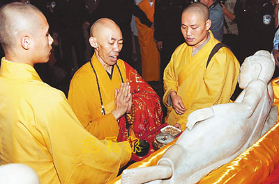 23日,福州雪峰寺崇聖禪寺舉行被盜玉佛回歸歡迎儀式,經過6個晝夜的連續奮戰,福州警方成功破獲閩侯縣雪峰崇聖禪寺珍貴文物失竊大案,抓獲6名犯罪嫌疑人。 (新華社)