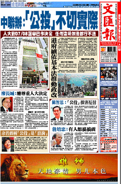 【新華社香港24日電】最近,香港特別行政區立法會個別議員就2007/08年行政長官和立法會產生辦法提出所謂「全民公投」的動議。新華社記者就此採訪了中央人民政府駐香港特別行政區聯絡辦公室負責人。