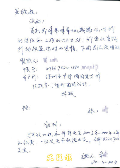 于亞新介紹的事情過程是:她於02年曾和兒子親自赴港,各購買了一份人壽保險,並繳交02年全年保費;至03年,負責該份保單的友邦保險經紀朱某要求于女士一次過繳交03及04年保費,指可以申請在04年繳交,她答允後將保費寄給朱某指定的深圳戶口(見左圖),其後並收到「正本收據」。