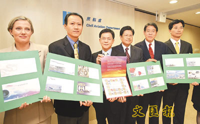 民航處處長羅崇文(左三)展示周末發行的紀念郵票及首日封。 (劉國權 攝)