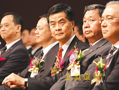 梁振英(左二)指有議員提出公投一事,「於法於理俱不合」。 (張立新 攝)