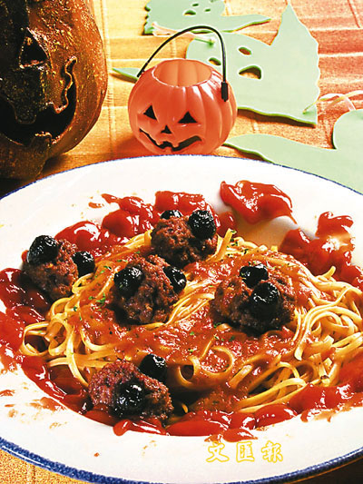 新鮮的肉丸上放有兩粒黑橄欖,成了眼睛凹陷的骷髏頭,鋪放在血紅的茄汁意粉上,賣相十分駭人。