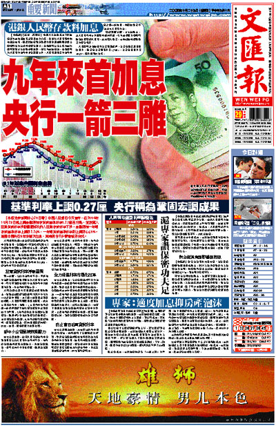 人行負責官員昨天回應記者提問時指出,針對近期經濟金融運行中仍然存在的一些矛盾和問題,為了進一步鞏固宏觀調控成果,人民銀行報經國務院批准,決定上調基本利率。他說,上調利率有利於進一步發揮經濟手段在資源配置和宏觀調控中的作用;有利於防止企業過多佔壓資金,緩解部分企業流動資金緊張狀況,減少資金體外循環;有利於優化經濟結構,提高經濟效益,保持國民經濟持續、快速、協調、健康發展的良好勢頭。