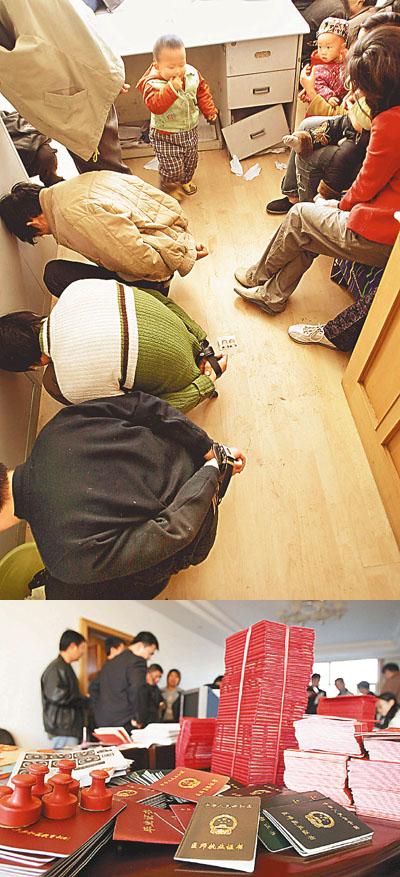 吉林長春市周三掃蕩偽造假證書的秘密工場,拘捕12人,沒收2,000張證書、圖章及製造工具。下圖為繳獲的大批假證件及印章。(美聯社)