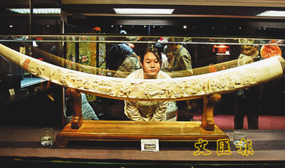 北京王府井工藝大廈近展出工藝精品。圖為由一級工藝美術大師李春珂帶領徒弟,費時兩年多製作的「韓熙載夜宴圖」象牙浮雕,長1.8米﹐雕工細膩。 (中新社)