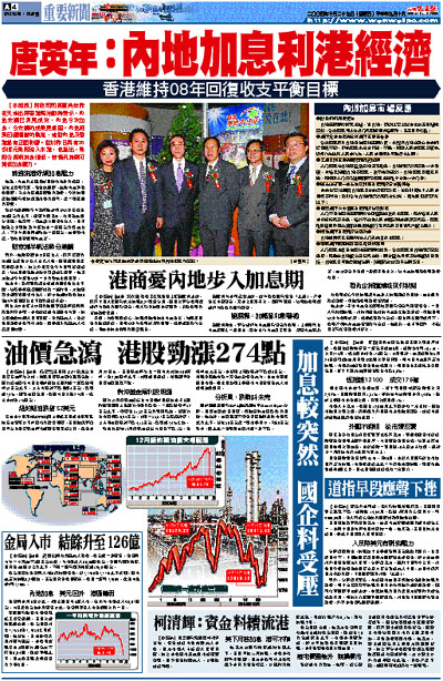 【本報訊】財政司司長唐英年昨在天津出席香港周活動時表示,內地宏調已初見成效,內地今次加息,令宏調的成果更穩固。內地經濟回復適當的軌道,這對內地及香港都有正面影響。對於昨日再有30多億元熱錢流入本港,他指出,熱錢令長期拆息偏低,若情況持續可減低加息壓力。