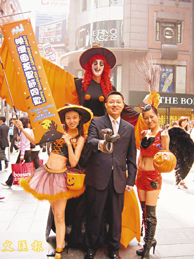 10月底又係西方的萬聖節,大家都可以輕輕鬆鬆來扮鬼扮馬狂歡一番。一向創意無限的長實集團,為配合萬聖節到來,特別於本周六及日於中環怡安華人行的售樓處安排「映灣園萬聖節同歡」,而今、明兩日的中午更特別於中環舉行「映灣園萬聖節巡遊」,由「魔鬼之女」及「嬌俏女巫」伴隨「巨人魔鬼法師」,為活動作介紹巡遊、派發萬聖節糖果及扭扭氣球,場面都幾有氣勢。既可以幫長實係東涌的新盤映灣園促銷,又可以令中環增添不少節日歡樂氣氛,都幾有心思。