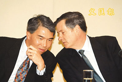 星展銀行(香港)主席黃鋼城(左)與行政總裁蘇禮文密斟。(張偉民 攝)