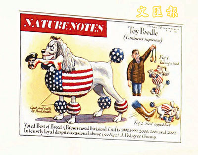 英國最近舉行一次政治漫畫展覽,其中最惹人注目是當地的報章和雜誌,在過去10年對首相貝理雅的描繪越來越嚴苛,反映出英國傳媒和普羅大眾對貝理雅的觀感出現顯著變化,從當初把他追捧為傑出政壇新彗星,變成今時今日滿身邪惡的美國跟尾狗。