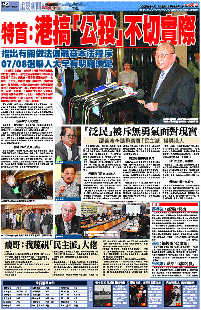 【本報訊】(記者 莊海源)特區行政長官董建華昨日公開表示,部分立法會議員就07和08年選舉進行「公投」的建議,是不切實際的做法。他指出,「公投」的做法離開《基本法》已確定的程序,而且全國人大已就香港07和08年兩個選舉作出了明確的決定,港人要據此積極地作出研究、落實。他強調,「試圖改變全國人大這個決定的做法是不恰當的。」因此,特區政府不會就政制發展採取「公投」的方式,也不會贊成任何團體去組織市民進行「公投」的建議。