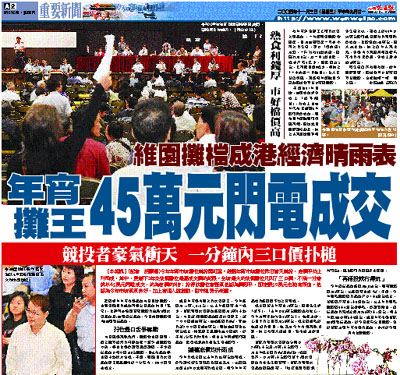 【本報訊】(記者 胡靜嫻)今年年宵市場攤位競投開紅盤。維園年宵市場攤位昨日首天競投,底價平均上升兩成,其中,更創下3年來快餐攤位最高成交價的紀錄。全場最大的快餐攤位只叫了三口價,不消一分鐘就以45萬元閃電成交,約為底價的4倍;投得該攤位者豪氣地認為價錢平,即使要50萬元也物有所值。他認為今年市場氣氛良好,加上有個人遊推動,對市道表示樂觀。