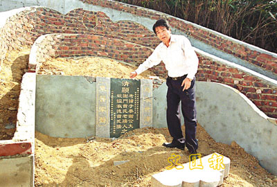 【本報訊】在淝水之戰中,以八萬大軍大勝前秦百萬大軍的東晉名將謝玄,其後人安放在沙田黃屋村的祖墳,因受到馬鐵工程影響,遷往沙田圍村「藏風聚水」的風水穴重新安葬,由謝氏後人合資修建。詎料,工人昨到新祖墳施工時,赫然發現墳頭被毀,謝氏後人之一的村長聞訊趕至,目睹祖墳無故被毀,感慨說:「死人都搞,顧住有報應!」